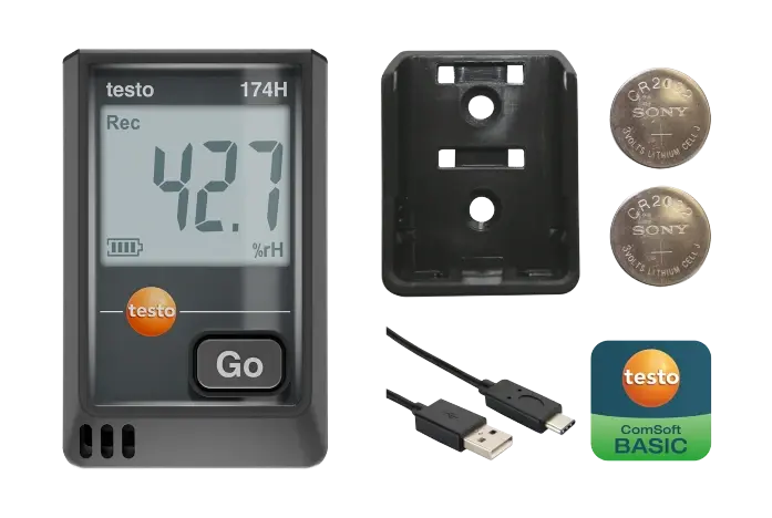 testo 174 H mini sıcaklık ve nem data logger’ı; duvar braketi, 2 × CR2032 lityum pil, USB-C bağlantısı ve test raporu ile birlikte verilir.