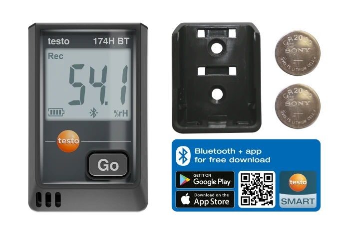 testo 174 H-BT mini sıcaklık ve nem data logger’ı, duvar braketi, 2 × CR2032 lityum pil ve test raporu ile birlikte verilir.