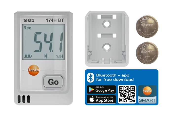 testo 174 H BT mini sıcaklık ve nem data logger’ı, duvar montaj aparatı, 2 × CR2032 lityum pil ve test raporu ile birlikte verilir.