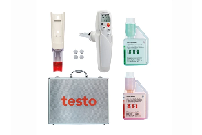 testo 205 pH/sıcaklık ölçüm cihazı, jelli saklama başlığı, pH 4 ve pH 7 kalibrasyon çözeltileri (250 ml), kemer/duvar braketi ve alüminyum taşıma çantası ile birlikte verilir.