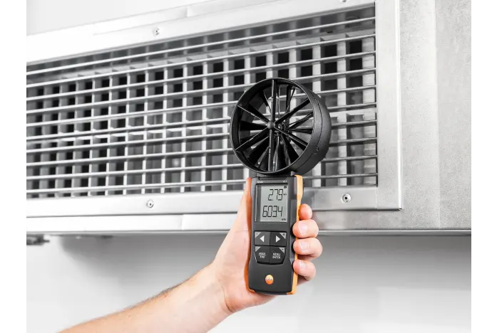 testo 417, havalandırma ve iklimlendirme sistemlerinde hava giriş ve çıkışlarını ölçmek için tasarlanmıştır. Cihaz, ölçüm sürecini hızlı ve pratik hâle getirir. Entegre 100 mm çaplı pervane, düşük ve orta hızlardaki hava akımlarını hassas biçimde algılar. Kullanıcı akış hızını, hacimsel akışı ve sıcaklığı tek cihazla ölçer. Cihaz ölçüm sırasında hacimsel akışı otomatik hesaplar.