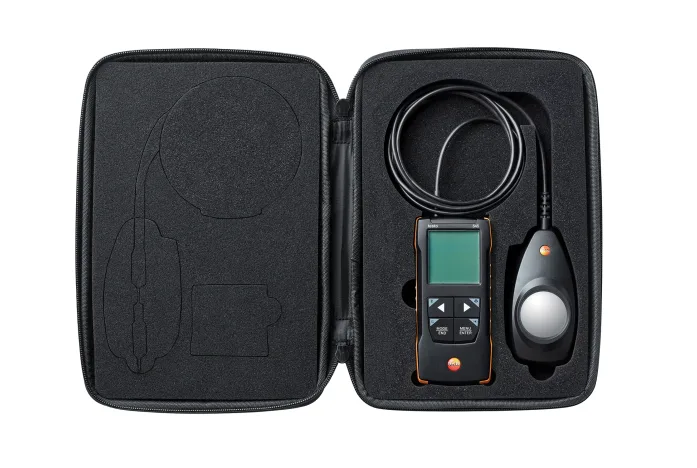 testo 545</strong> dijital lüksmetre (App bağlantılı), taşıma çantası, kalibrasyon protokolü ve 3 × AA pil ile birlikte verilir.